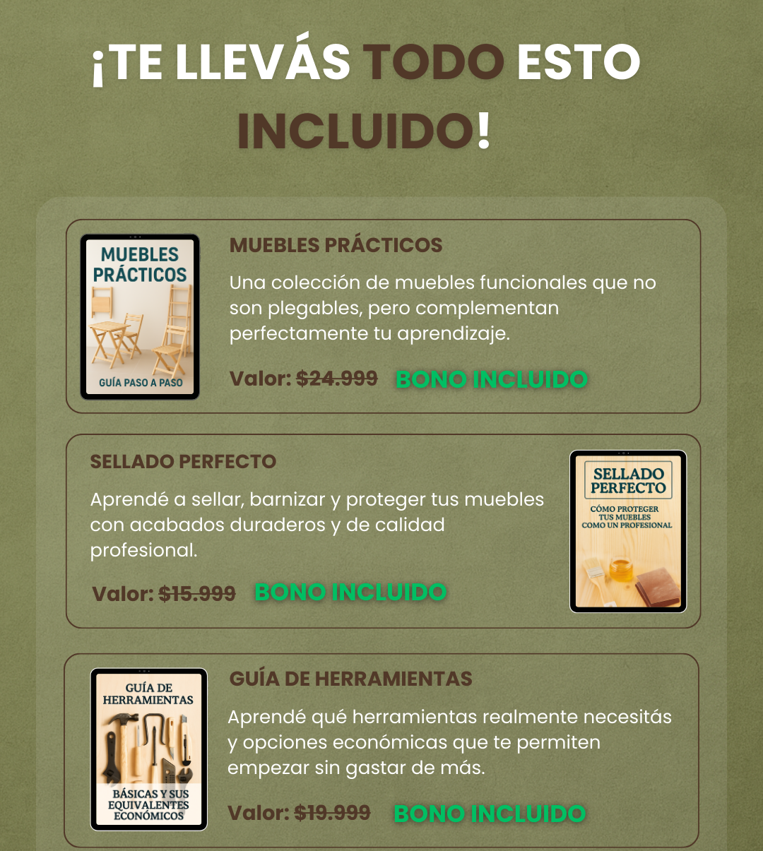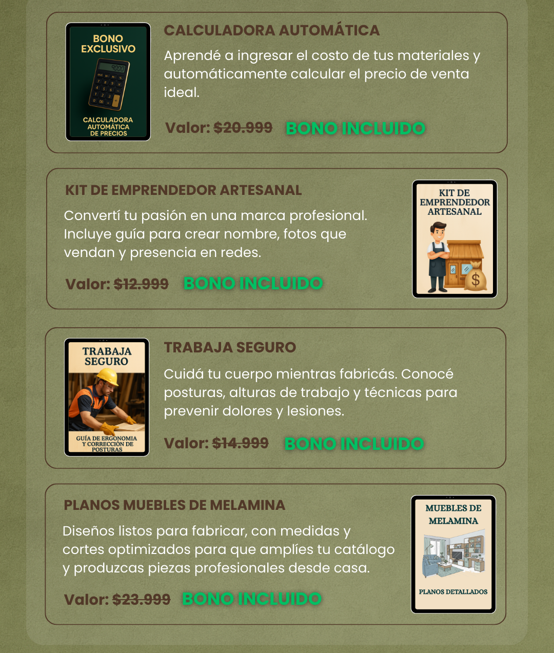 Recibís acceso inmediato a un archivo digital (PDF) con todos los planos y materiales, además de videos explicativos y la calculadora de precios.