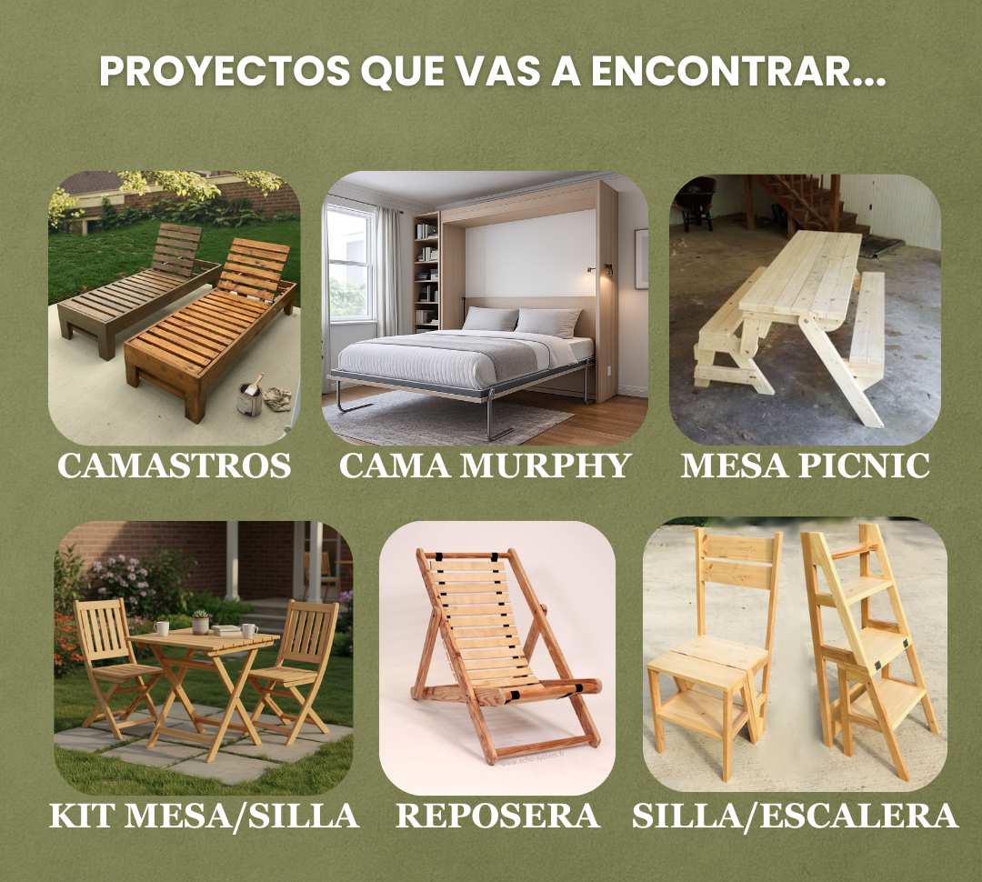 Más de 200 modelos: mesas, sillas, escritorios, camas Murphy, estantes, bancadas y mucho más, todos con planos, medidas y lista de materiales.